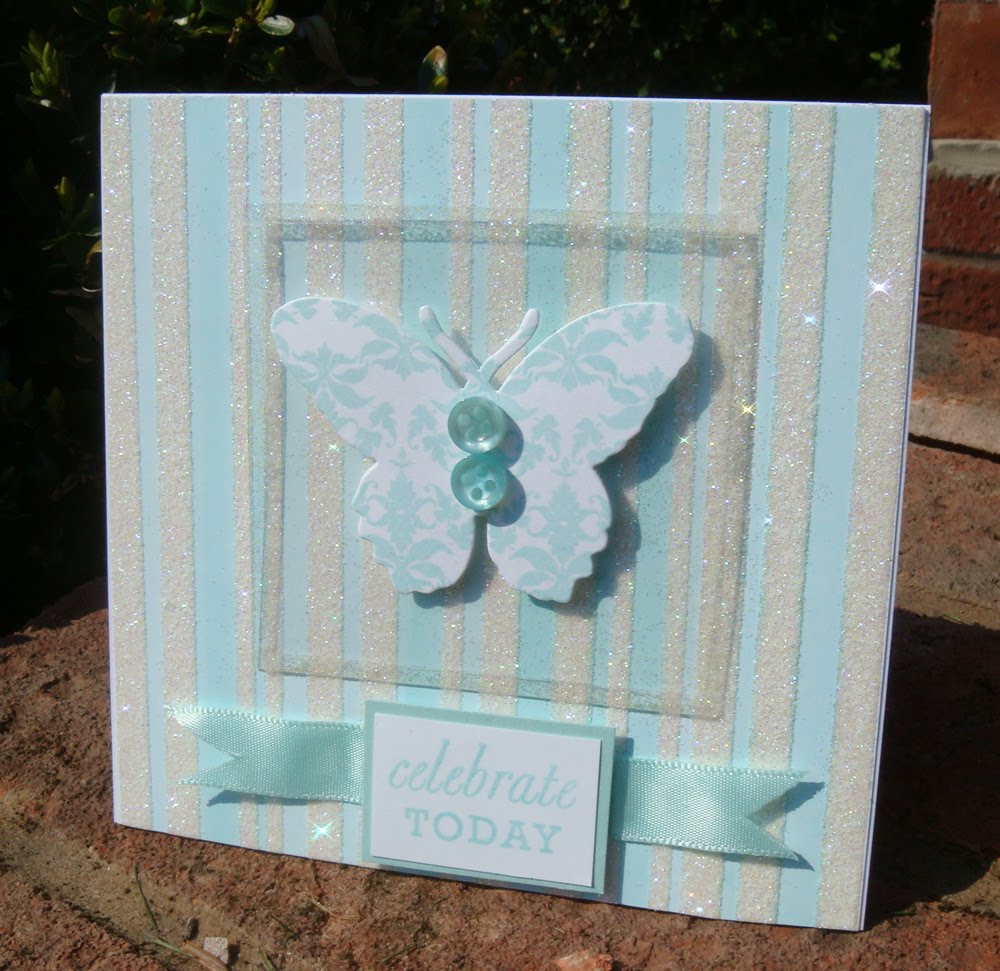 I simply put strips of different width DS tape on my card then filled in the gaps using my PM pen (chisel tip).  Then I peeled off the backing and sprinkled it all with prisma glitter – yay super sparkly!  I used a cuttlebug die for the butterfly and stamped it with Damask Designs in Aqua Mist and added AM buttons and ribbon.  The sentiment is from Mega Mixed Messages.