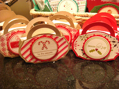Finally I made a bundle of little treat bags using the Favour It dies 1 and 2 from PTI.  These are so easy to make and decorate and are the perfect size for little treats.  I filled mine with home made Macaroon bars and home made tablet (two traditional Scottish delicacies kindly created by my mum).  To decorate them I used the Tiny Treats: Christmas set again and 2009 Holiday Tags both from Papertrey Ink.  The papers were just some I had lying in my cupboard from last year – amazing what you find that you forgot you had!