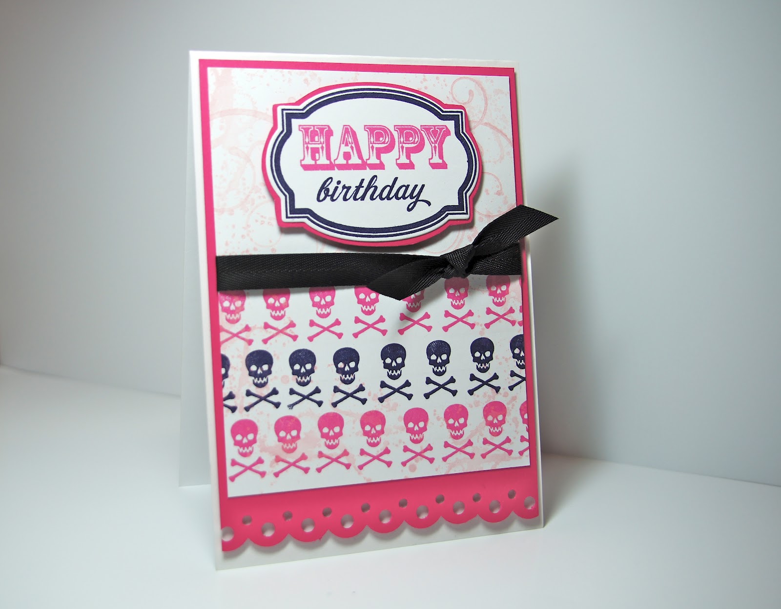 7. Oh, this is so great for a teen goth girl! (I know because my girl was a goth when she was a teen! She loved pink and black, skeletons and Hello Kitty!!) I really like the balance of this card between the multi-bordered sentiment and the rows of skulls!