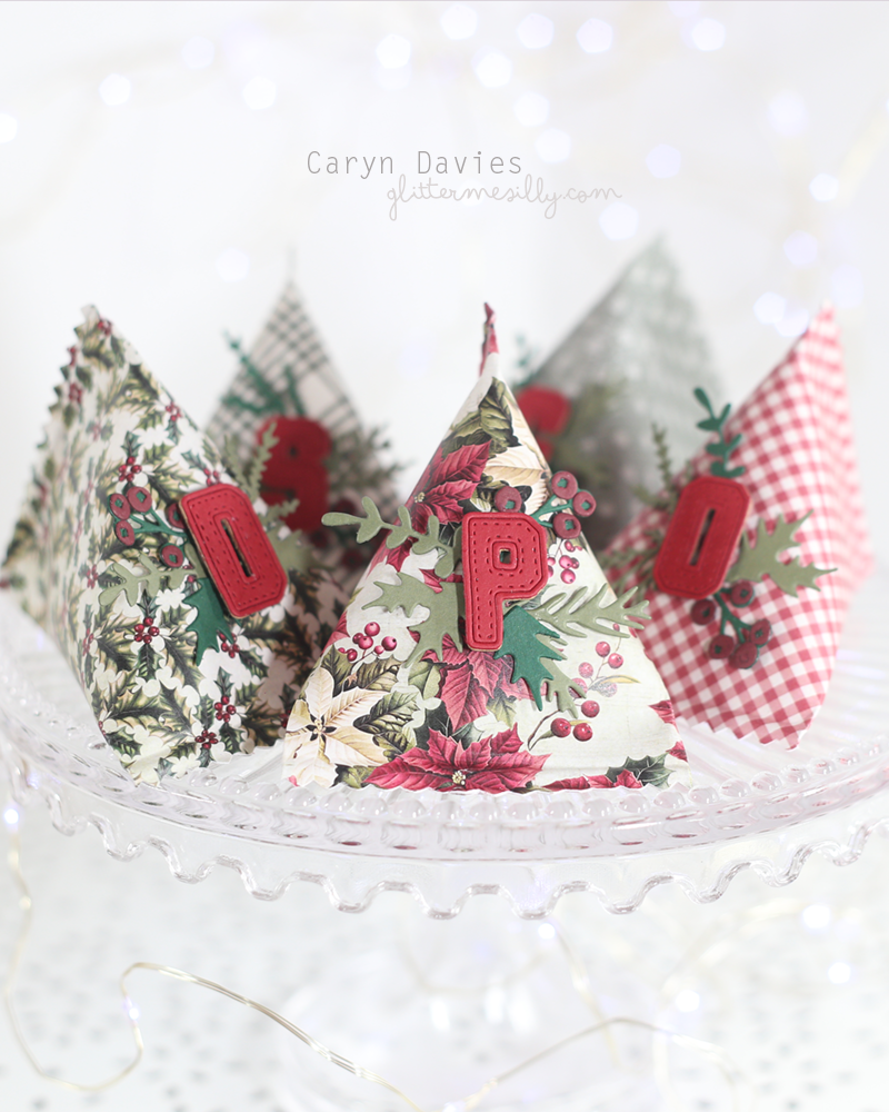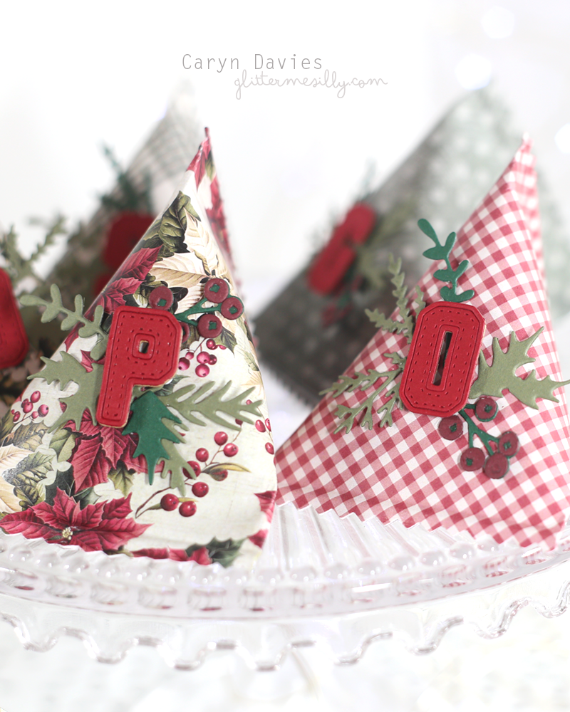 Each year I like to create personalised favours for the family for Christmas day. For this year I made these cute little boxes with chocolates from a gorgeous collection of papers called Christmas Holly Basics 6×6 from Paper Rose. I added a monogram for each of the family using Tim Holtz Alphanumeric Dies (I used Varsity which is no longer at Simon but any alphabet die set will work just as well). I added foliage die cuts using Tim Holtz Vault Festive Wreath and Vintage Sled Die sets.