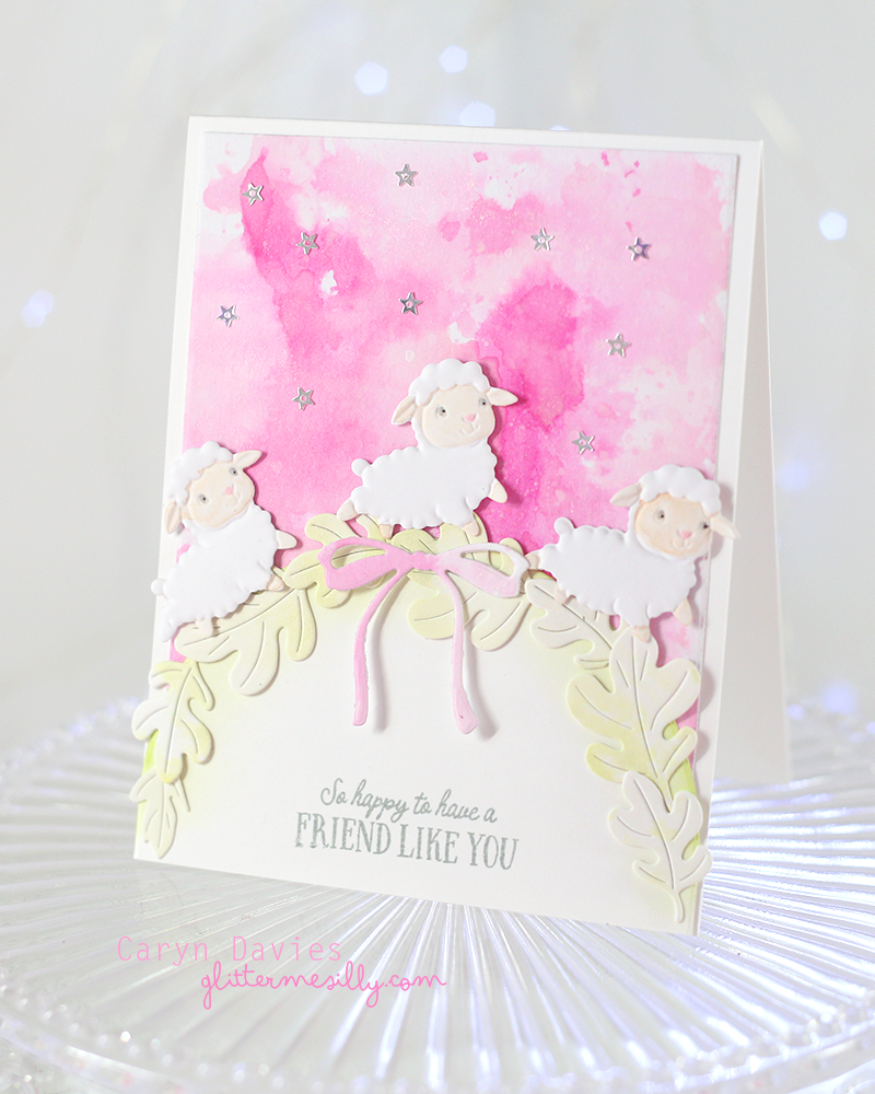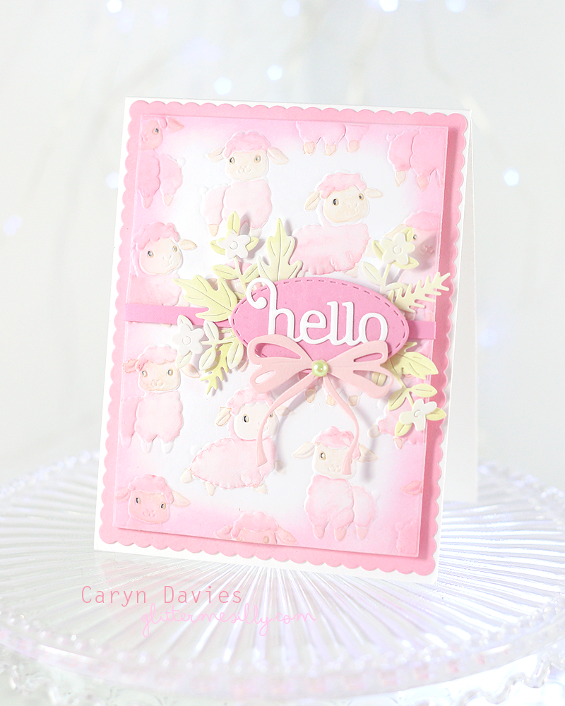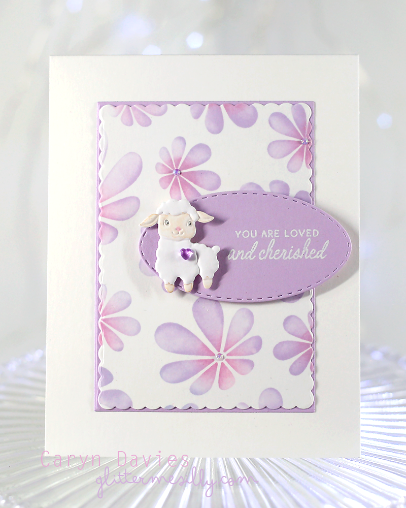 This next card features a die cut lamb from the Playful Lambs Embossing Folder with the beautiful Groovy Daisies Stencil. I die cut a Stitched Oval and made a mat layer using both the A2 Scalloped Rectangle Dies and A2 Rectangle Dies.