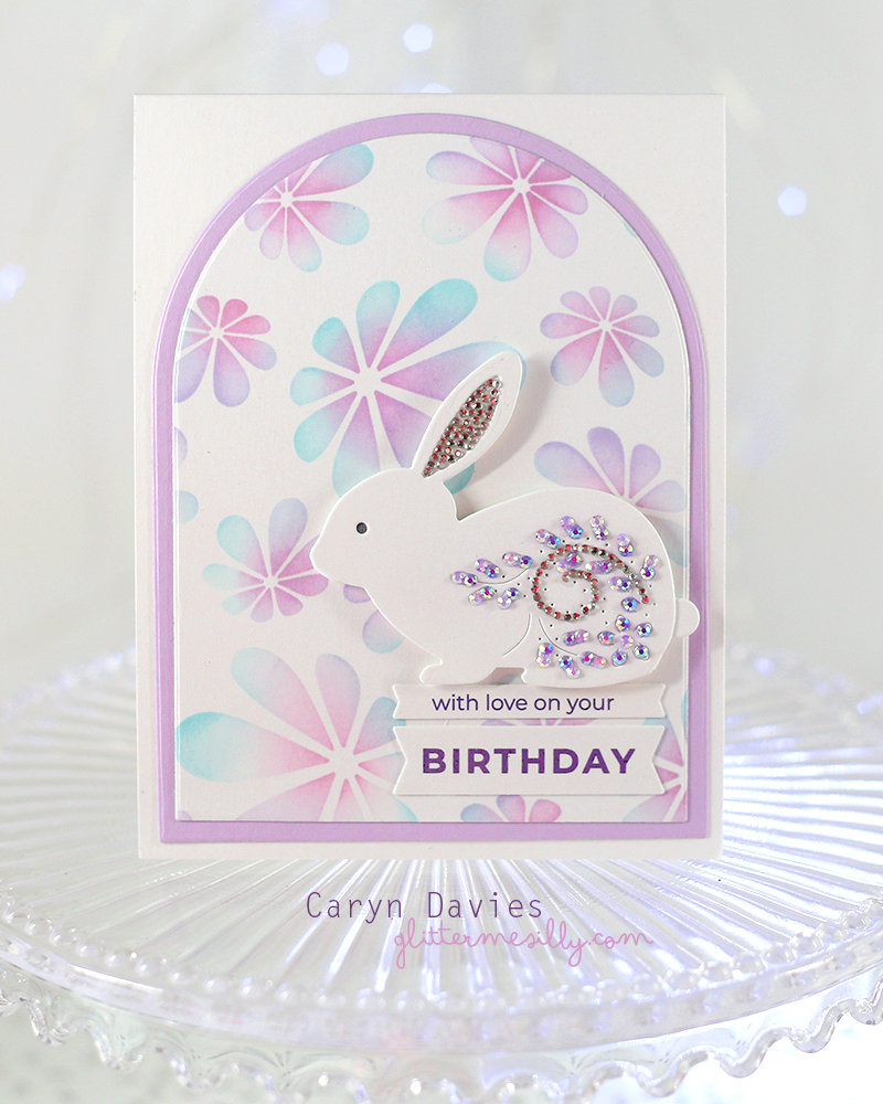 I have another spring themed card next using the fabulous Flourish Rabbit Die with the Groovy Daisies Stencil. I coloured the stencil using pink, lilac and aqua inks and then die cut the panel using the A2 Arches Dies and a mat. I die cut the rabbit then added tiny rhinestones along the details and in the ear. I finished it off with a sentiment using the EZ Strips Birthday foiled with purple foil.