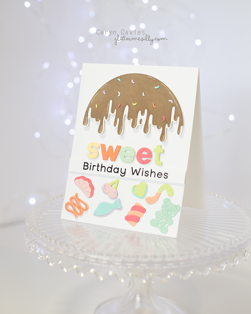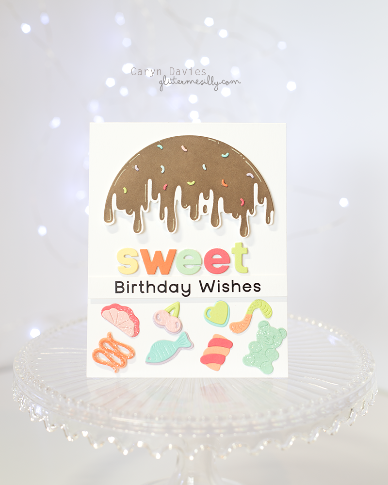 I grabbed my current favourite die collection from Hero Arts (Bear Hugs and Candy Kebob) and die cut a whole bunch of sweets from different shades of Concord and 9th cardstock. I assembled the pieces and added glossy accents to some and Rock Candy glitter to others.