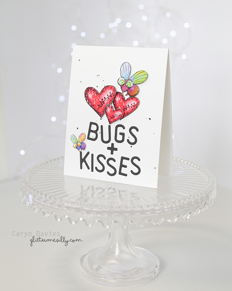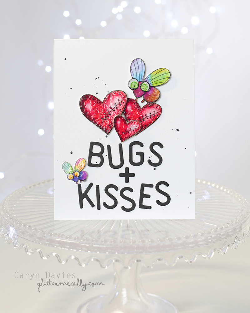 I die cut some letters using the Tim Holtz Letterboard die set to spell out Bugs & Kisses and added a few splatters to the backgound of my base card before adhering the embellishments.