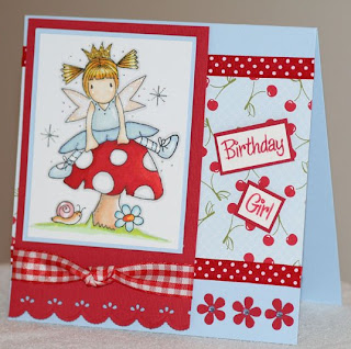 I have used that Gorjuss girl which is fast becoming my favourite one. She is coloured with promarkers (pastel blue, cornflower blue and china blue) as well as cocoa, cinanamon, raw umber, henna and burnt umber for the hair. The lace paper is from Joanna Sheen.